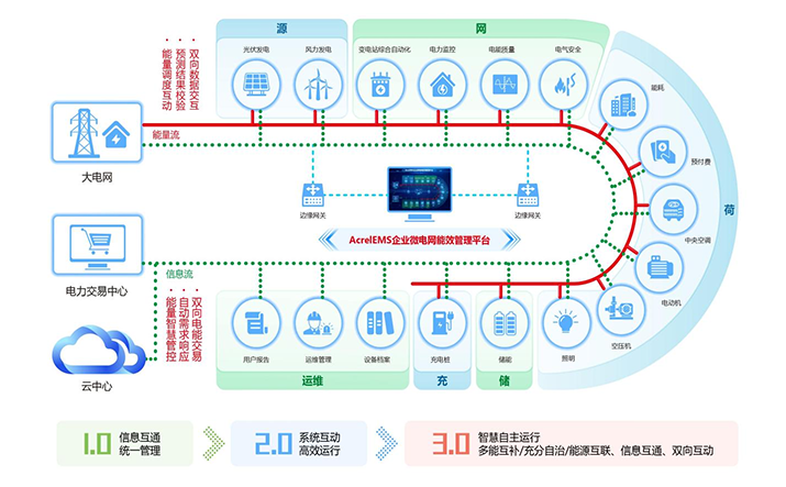 簡介:1.概述 通過在源、網(wǎng)、荷、儲、充的各個關鍵節(jié)點安裝監(jiān)測、分析、保護、治理裝置, 通過高性能邊緣計算網(wǎng)關采集數(shù)據(jù)并上傳至企業(yè)微網(wǎng)平臺。平臺根據(jù)新的電網(wǎng)價格、 用電負荷、電網(wǎng)調(diào)度指令等情況,調(diào)整各系統(tǒng)控制策略并遠程下發(fā),使企業(yè)微電網(wǎng)始終高效穩(wěn)定運行, 降低企業(yè)用電成本,實現(xiàn)能源互聯(lián)、信息互動。 2.應用場所 適用于各行業(yè)企業(yè)內(nèi)部微電網(wǎng)管理系統(tǒng)的新建、擴建、改建等項目。 3.平臺結(jié)構(gòu) 3.平臺功能 安科瑞AcrelEMS企業(yè)微電網(wǎng)能效管理平臺融合了電力監(jiān)控、電氣安全、照明控制、能源管控、充電樁運營管理、分布式光伏監(jiān)測、儲能管理、設備臺賬、運維管理等功能,通過一個平臺、一個APP整體的對企業(yè)用電進行集中監(jiān)控、統(tǒng)一調(diào)度、統(tǒng)一運維,并且根據(jù)當?shù)毓╇姴块T錯峰避峰計劃提前為企業(yè)制定錯峰避峰方案和預警,滿足企業(yè)